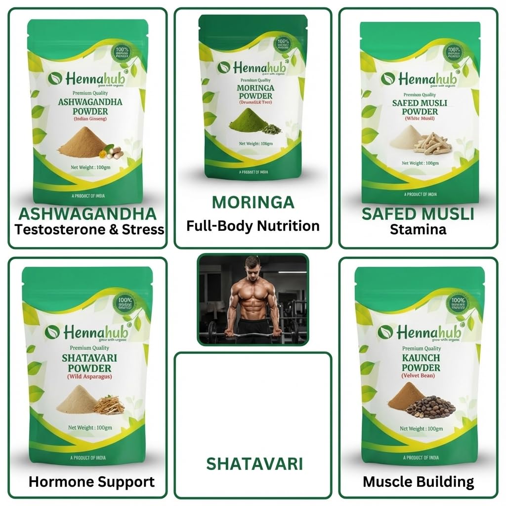 Hennahub Advanced Men’s Performance Combo | Ashwagandha, Safed Musli, Shatavari, Kaunch Beej & Moringa Powder | Pack of 5 x 100g | Strength, Energy, Vitality & Daily Nutrition | Ayurvedic Wellness Boost