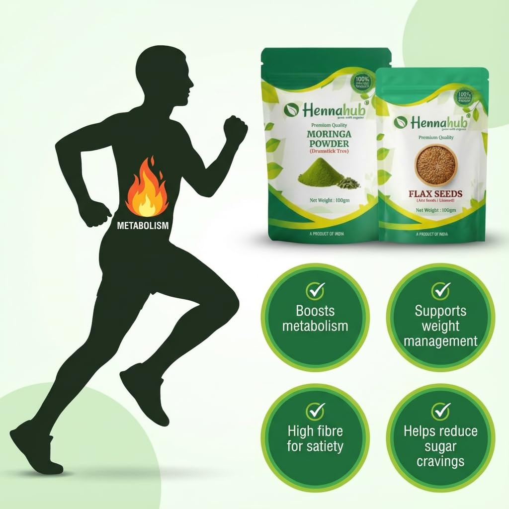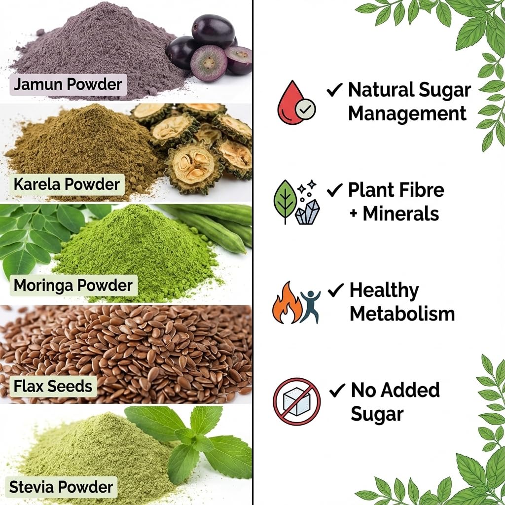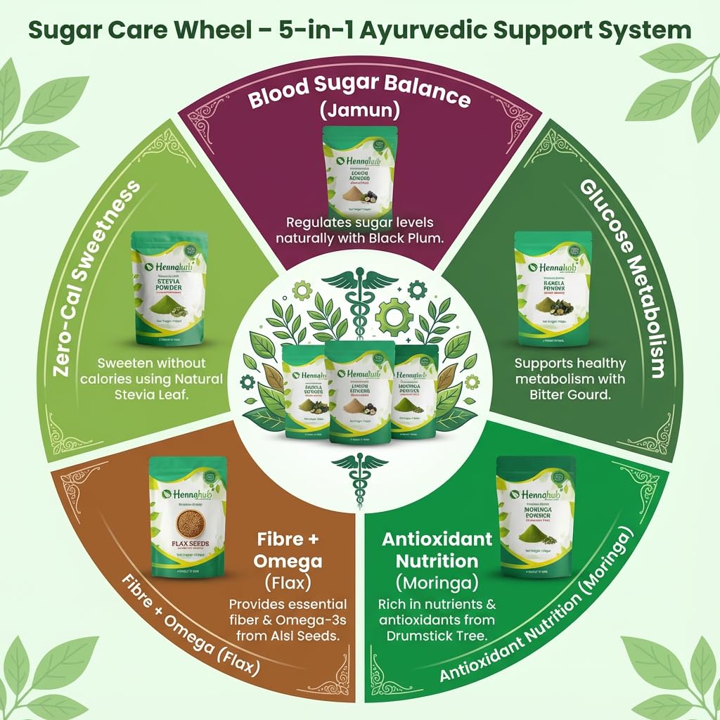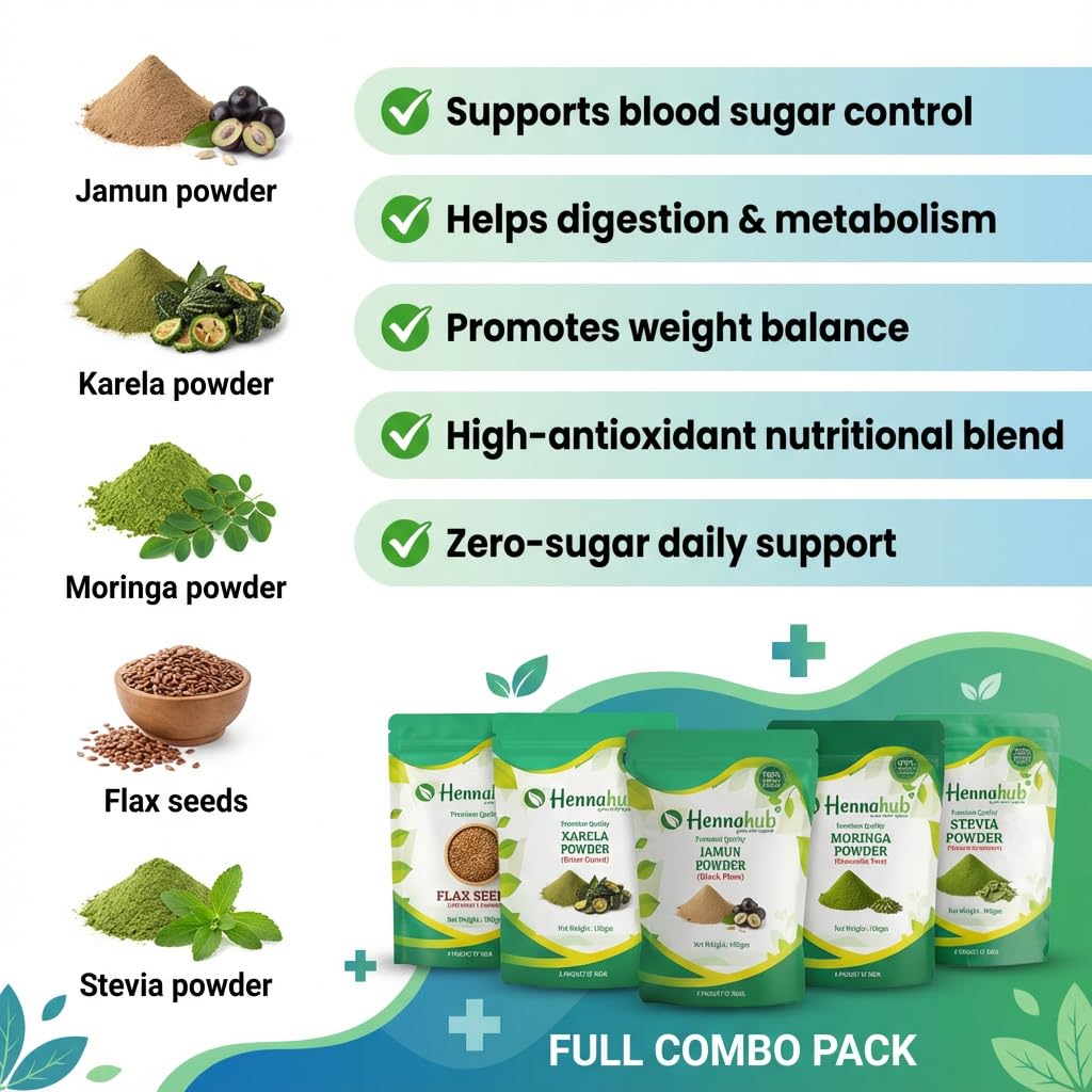 Hennahub Complete Sugar Care Combo | Jamun Powder, Karela Powder, Moringa Powder, Flax Seeds & Stevia (Powder | Pack of 5 | Blood Sugar Management, Metabolism & Weight Control | Ayurvedic Daily Support