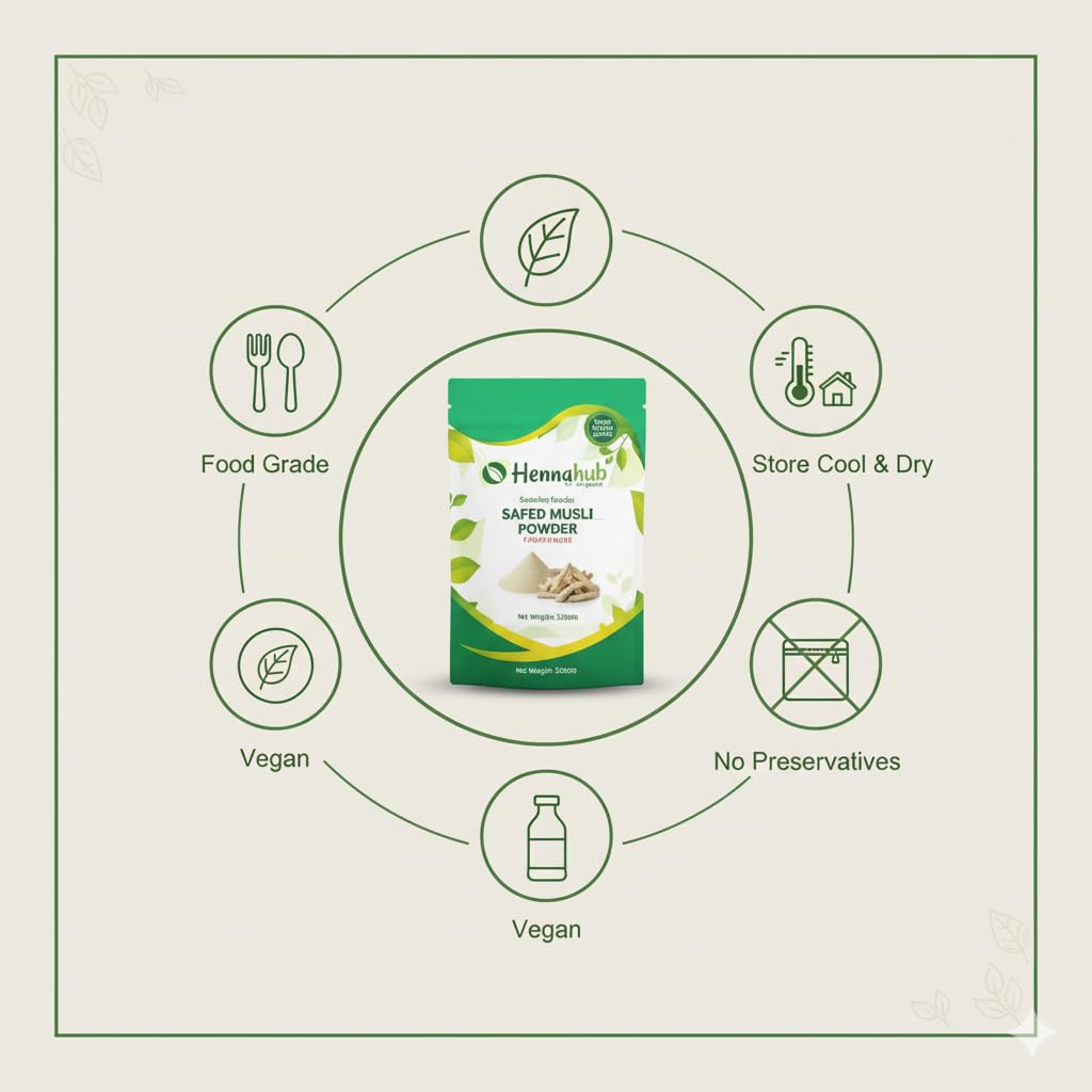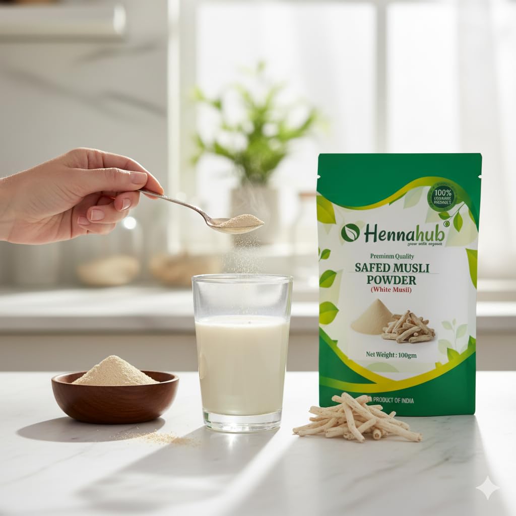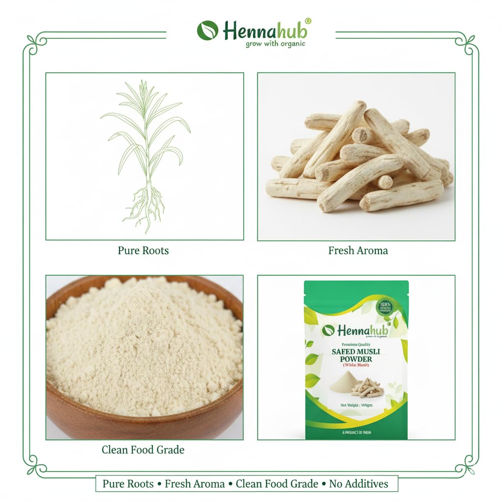 Hennahub Safed Musli Powder (Food Grade) 100gm Pack | 100% Pure Chlorophytum borivilianum Root Powder | Natural Plant-Based Ingredient for Smoothies, Milk & Herbal Drinks
