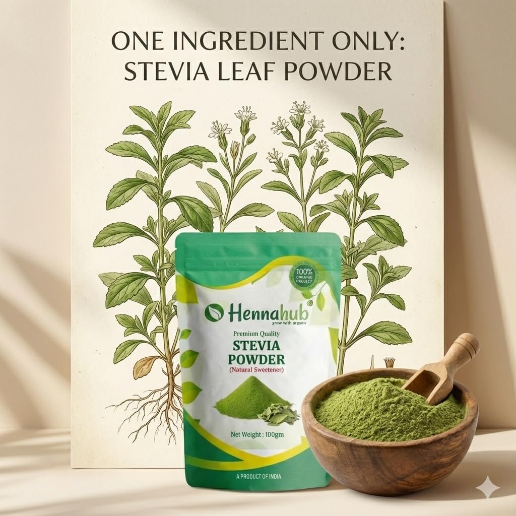 Hennahub Dried Stevia Leaves 100gm (Food Grade) is a 100% natural herbal sweetener made from pure Stevia rebaudiana leaves. These whole raw sabut leaves are sun-dried to preserve sweetness, nutrients, and aroma — making them the perfect zero-calorie replacement for sugar in your daily routine.