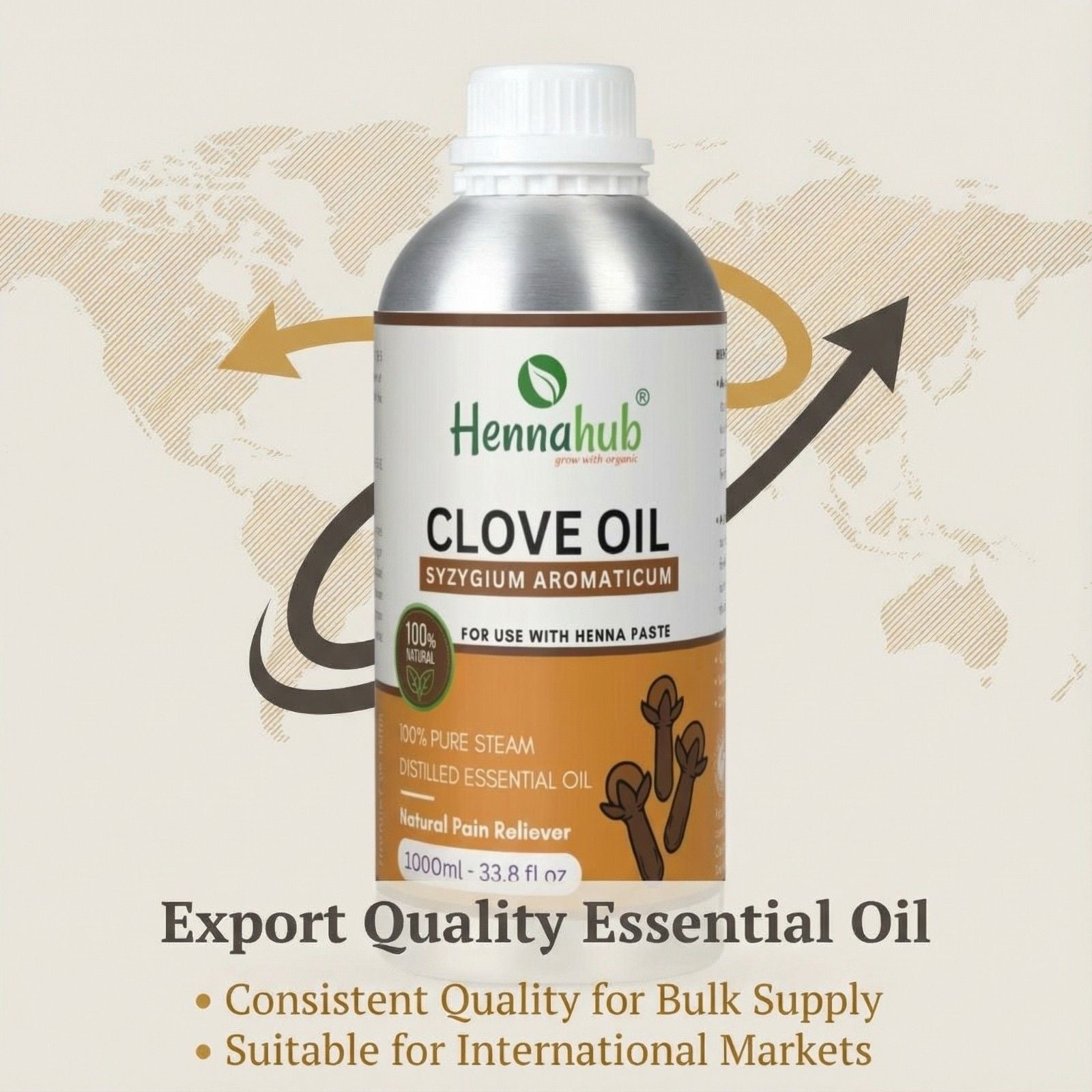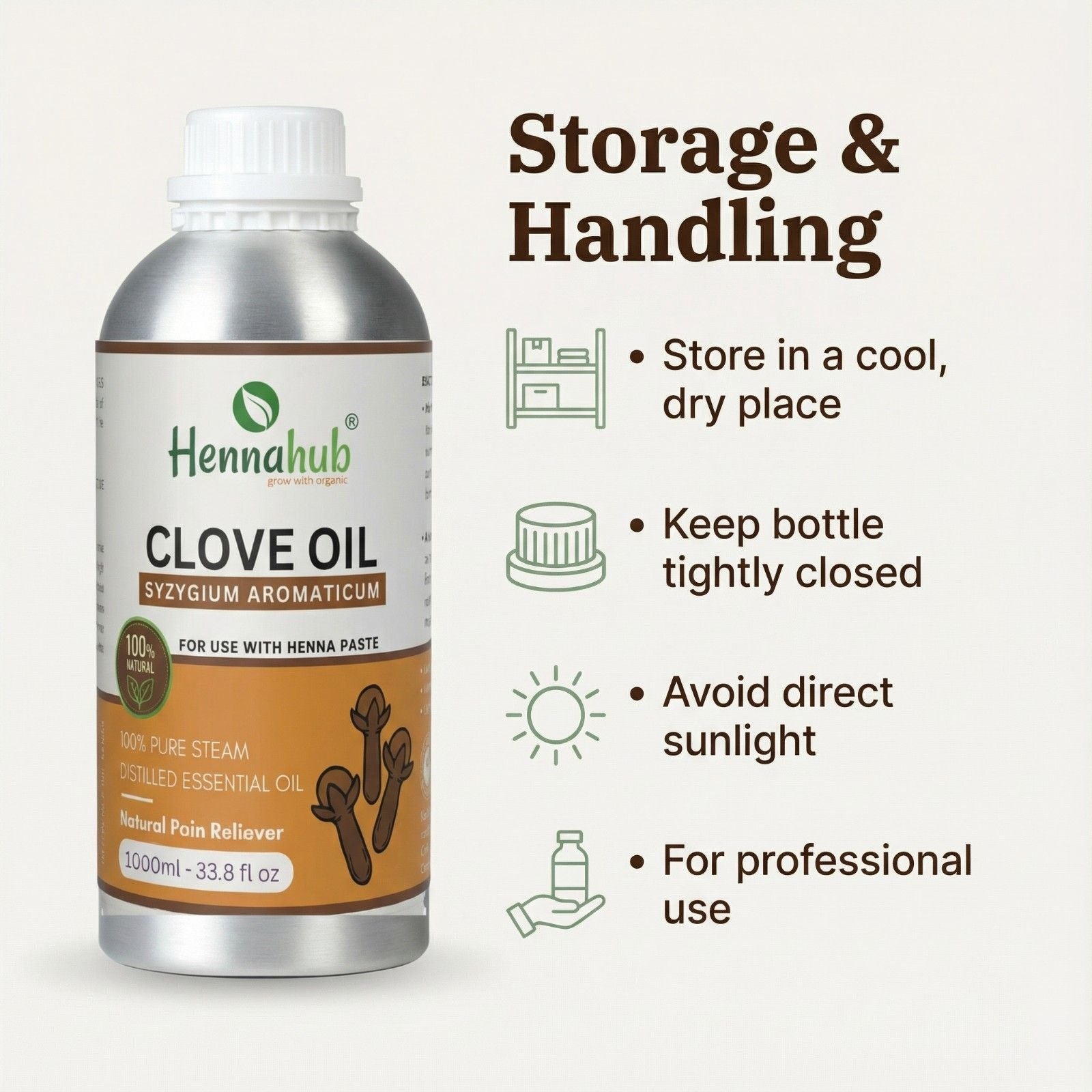 Pure Clove Essential Oil 1000ml is a steam-distilled oil supplied for routine use. In henna workflows, many artists choose clove oil for its distinctive warm fragrance and its place in stain-focused routines. Final stain depth depends on multiple factors, including henna quality, paste recipe, sealing time, and aftercare.