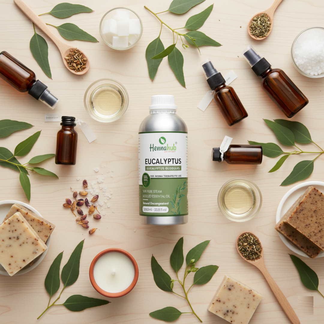 Hennahub Pure Eucalyptus Essential Oil is extracted through advanced steam distillation from freshly harvested eucalyptus leaves. Known for its strong, refreshing aroma and natural healing power, this essential oil helps relieve cold, congestion, muscle pain, and enhances henna color depth. Perfect for personal wellness, salons, and export buyers seeking premium, undiluted quality.