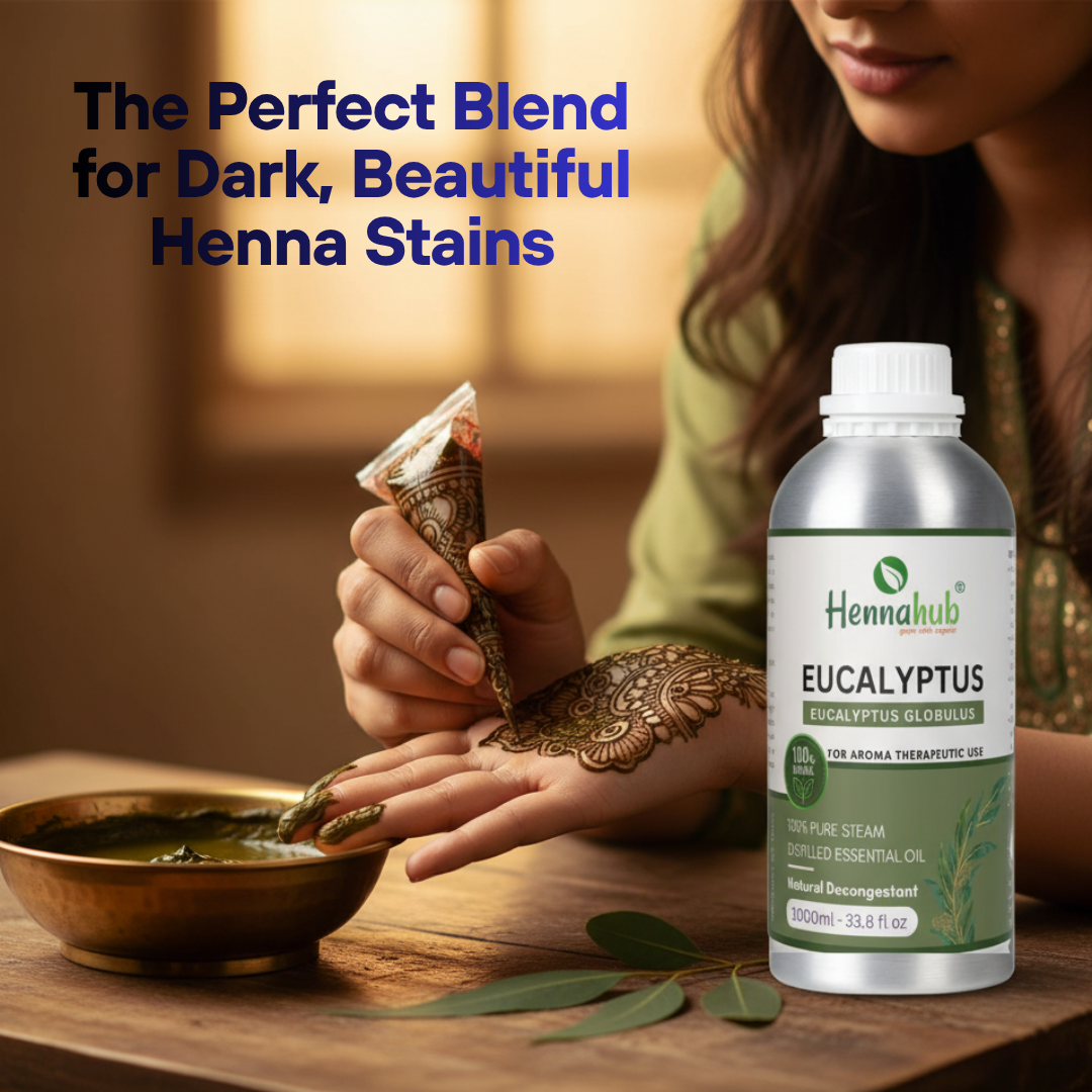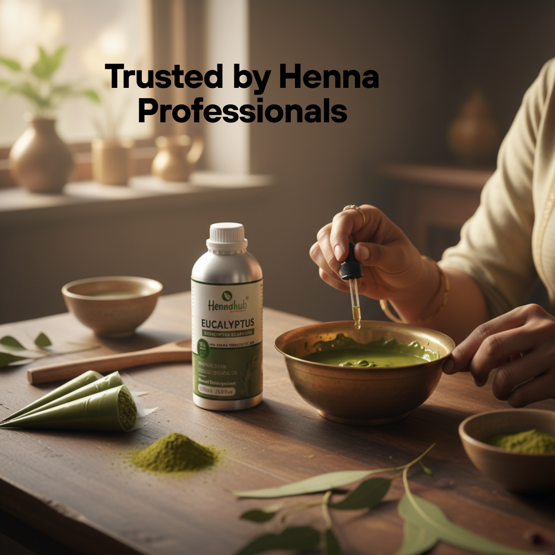 Professional henna artists choose Hennahub Eucalyptus Oil to ensure smooth application, fast color development, and a soothing, herbal aroma.